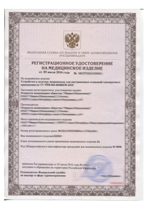 Регистрационное удостоверение Росздравнадзора (регистрационное удостоверение Минздрава) подтверждает, что продукция медицинского назначения зарегистрирована на территории Российской Федерации и внесена в Государственный реестр изделий медицинского назначения и медицинской техники